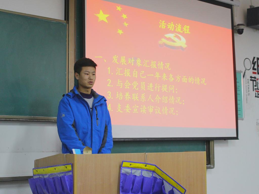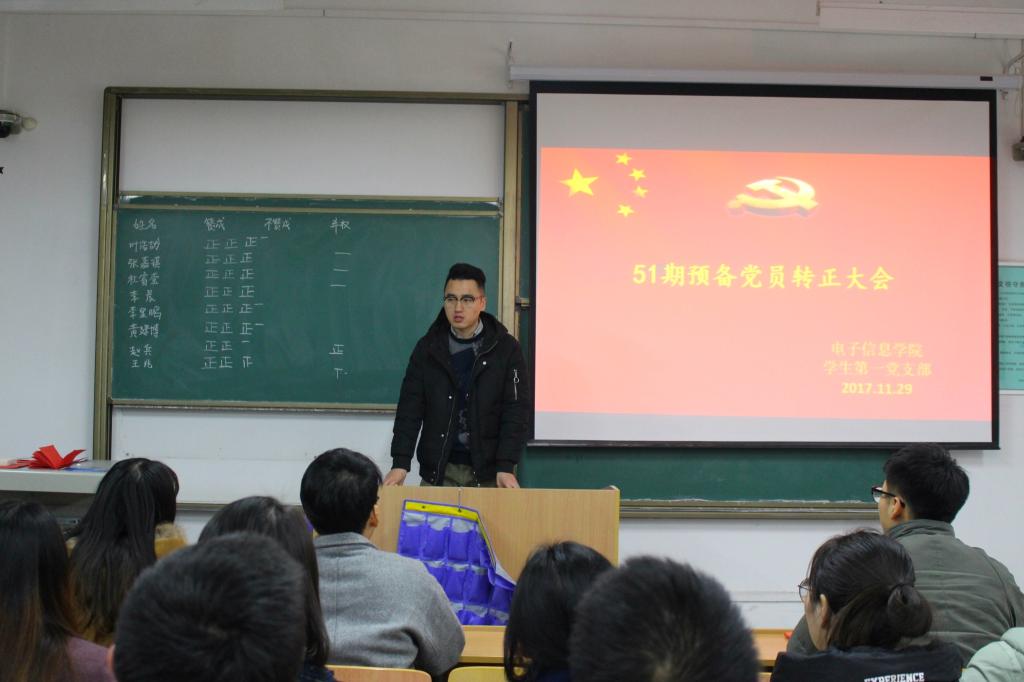 为加强学校基层党组织建设,做好发展党员工作,2017年11月29日,电子信息学院学生第一党支部在教学楼A124召开了第51期预备党员转正及第53期发展对象接收预备党员大会。参加本次大会的有学生第一党支部书记杨松然,支部全体党员以及第53期的发展对象。会议由党支部副书记闫娅娅同志主持。