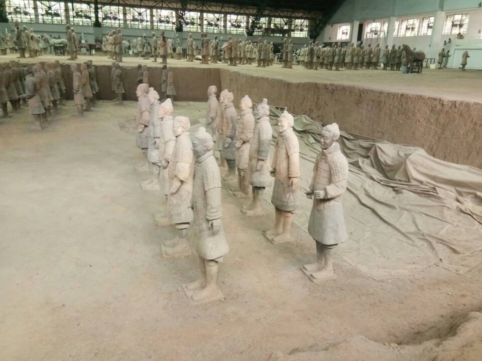 秦始皇陵兵马俑被称为世界第八大奇迹,以恢弘磅礴的气势,威武严整的军阵,形态逼真的陶俑展示出东方文化的灿烂辉煌。其悠久的历史、宏大的建筑规模与艺术效果,使大家被中国古代人民的智慧深深折服。