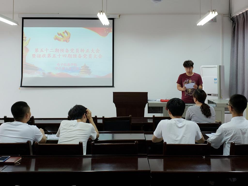 2018年6月20日中午,电子信息学院学生第七党支部在电信学院楼419会议室召开第52期预备党员转正大会。学生第七党支部全体党员及发展对象参加了本次会议,大会由支部副书记王君屹同志主持。