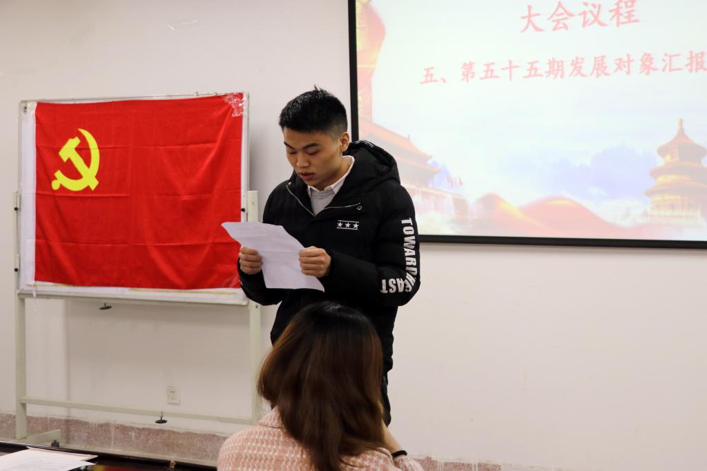 大会第二项,由四名发展对象汇报自己在一年考察期内学习、生活、工作、思想等方面的情况,同时表达了自己对加入中国共产党的态度和决心。