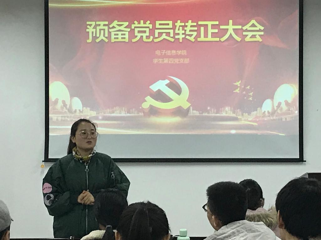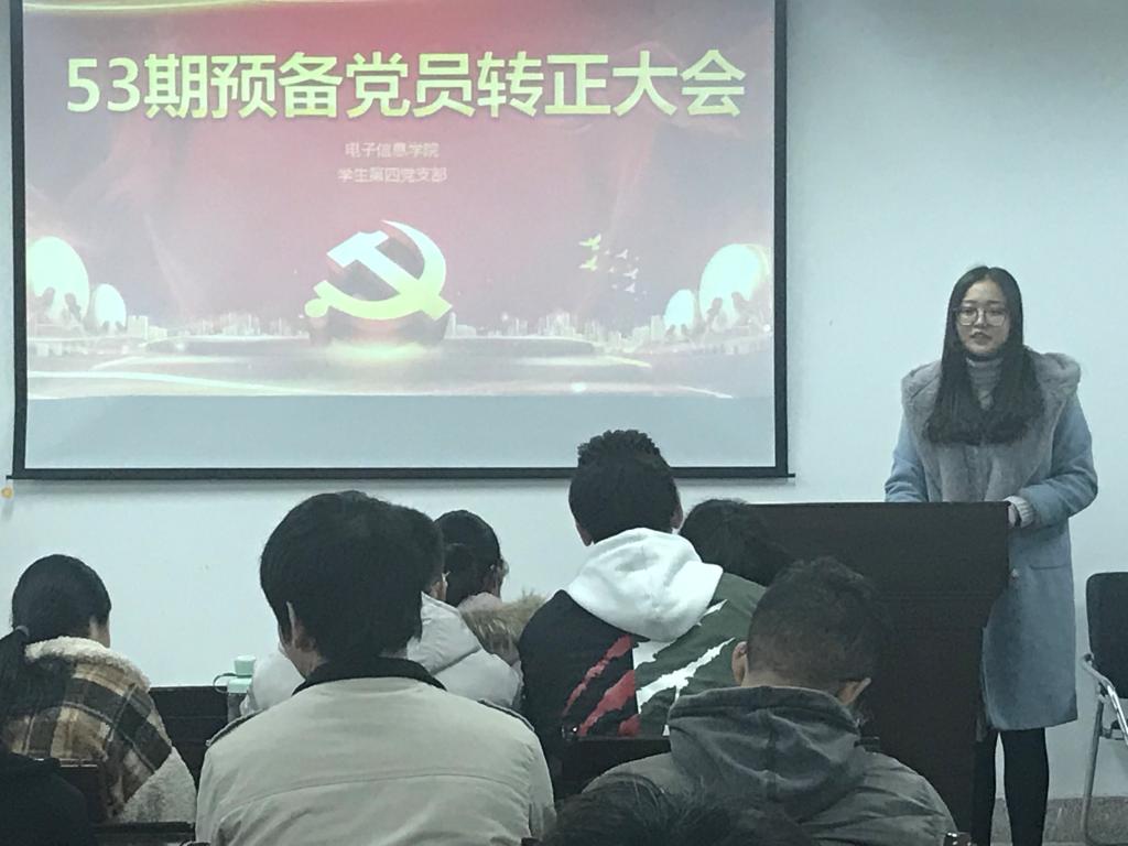 为加强学校基层党组织建设,电子信息学院学生第四党支部于2018年12月6日中午12:00,在电信楼419召开预备党员转正暨接收预备党员大会,16位正式党员、14位预备党员包括53期预备党员和9位55期发展对象参加了本次会议。会议由党支部副书记王毛主持。