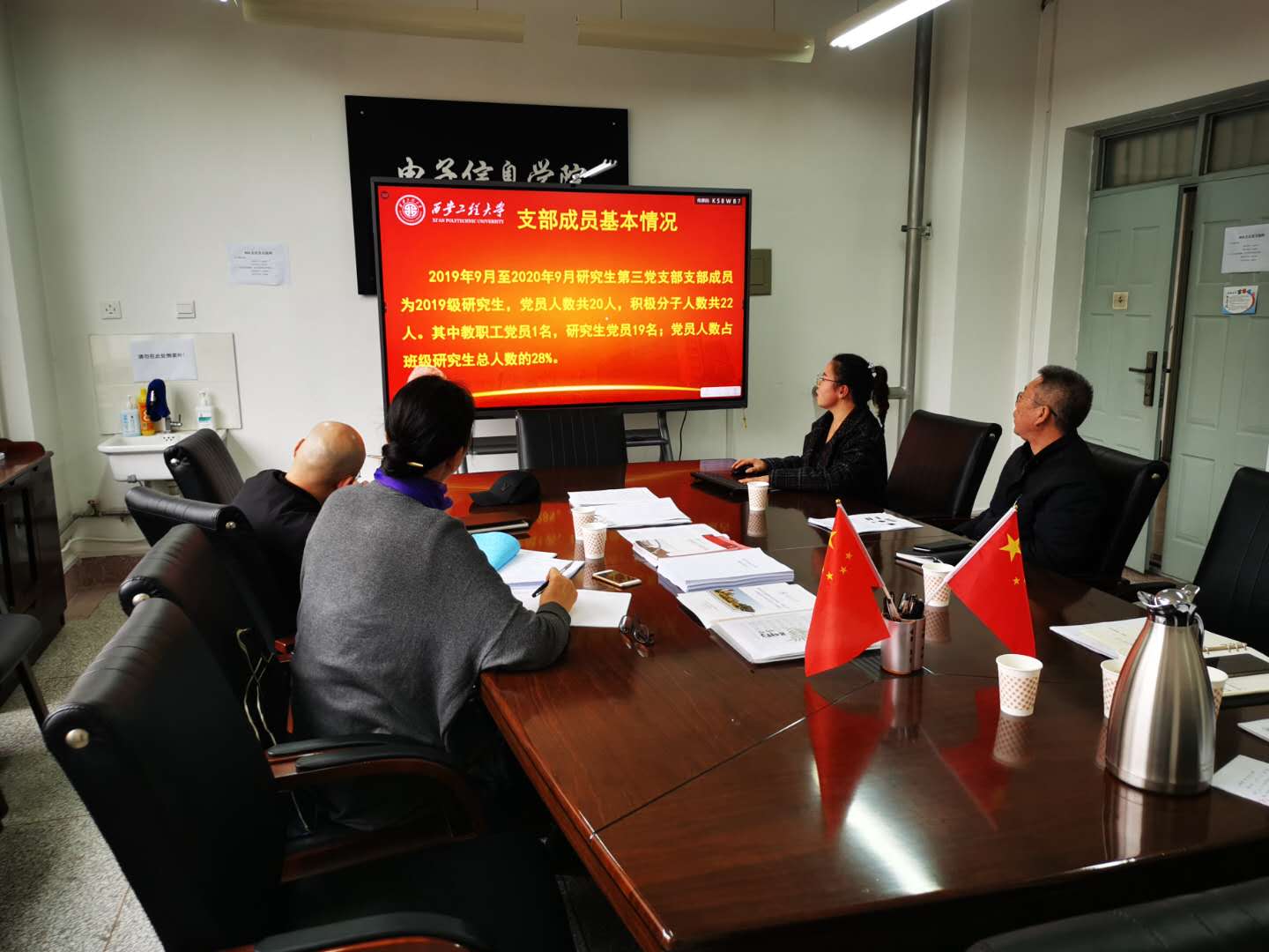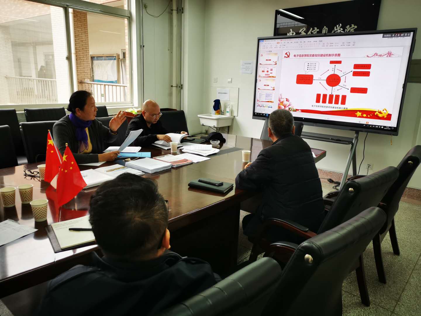 2020年10月29日下午2:30,校党委组织部正处级组织员邢瑞芳、校党委宣传部副部长戴新一行来到电子信息学院进行校级党建“双创”建设中期考核检查与指导。检查汇报会在电信楼414会议室举行,电信学院院党委书记杨恩科、副书记刘许、研究生第三党支部副书记刘润利及学工办主任朱宇军参加了会议。