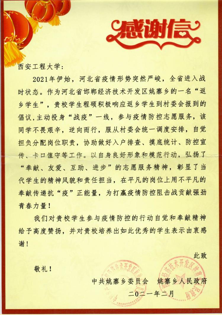 在砥砺奋斗中锤炼党性。在抗击肺炎疫情中,党员在先。近日,我院收到了一封来自河北省邯郸经济技术开发区姚寨乡人民政府寄来的感谢信,感谢学院学生第五党支部党员程硕在当地疫情防控期间的志愿服务。在疫情防控期间,我院有数十名师生不计个人安危,志愿参与当地防控工作中,程硕只是其中一名代表,他讲到:在选择逆行而上,投入志愿服务时,没有多想,只是党员的身份驱使着他,必须要做点什么,短暂又紧张的志愿服务,也更加坚定了自己努力学习、报效祖国的决心。学院执行院长景军锋等系部负责人倾心接待了研究生院院长刘晓喆、副院长傅博娜等一行人的走访调研,就研究生培养、管理等问题进行了深入交流和研讨,双方均表示要本着“解决学院发展、学生发展的实际困难”的初心,切实想办法、出实招,助力学院教育事业发展再上新台阶。学院党委书记杨恩科、副书记刘许带领全体学工队伍深入学生宿舍,与学生面对面交流,了解学生思想动态和实际困难,给予学生学习、生活、工作上的关心和帮助。学院师生一心、在自己的位置上用奋斗书写使命,推动党史学习教育“我为群众办实事”实践教育落到实处。