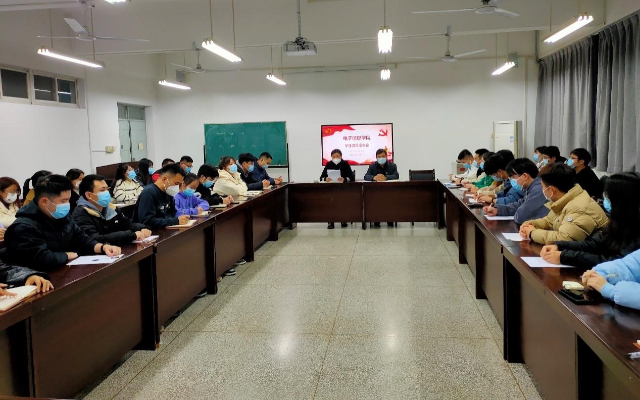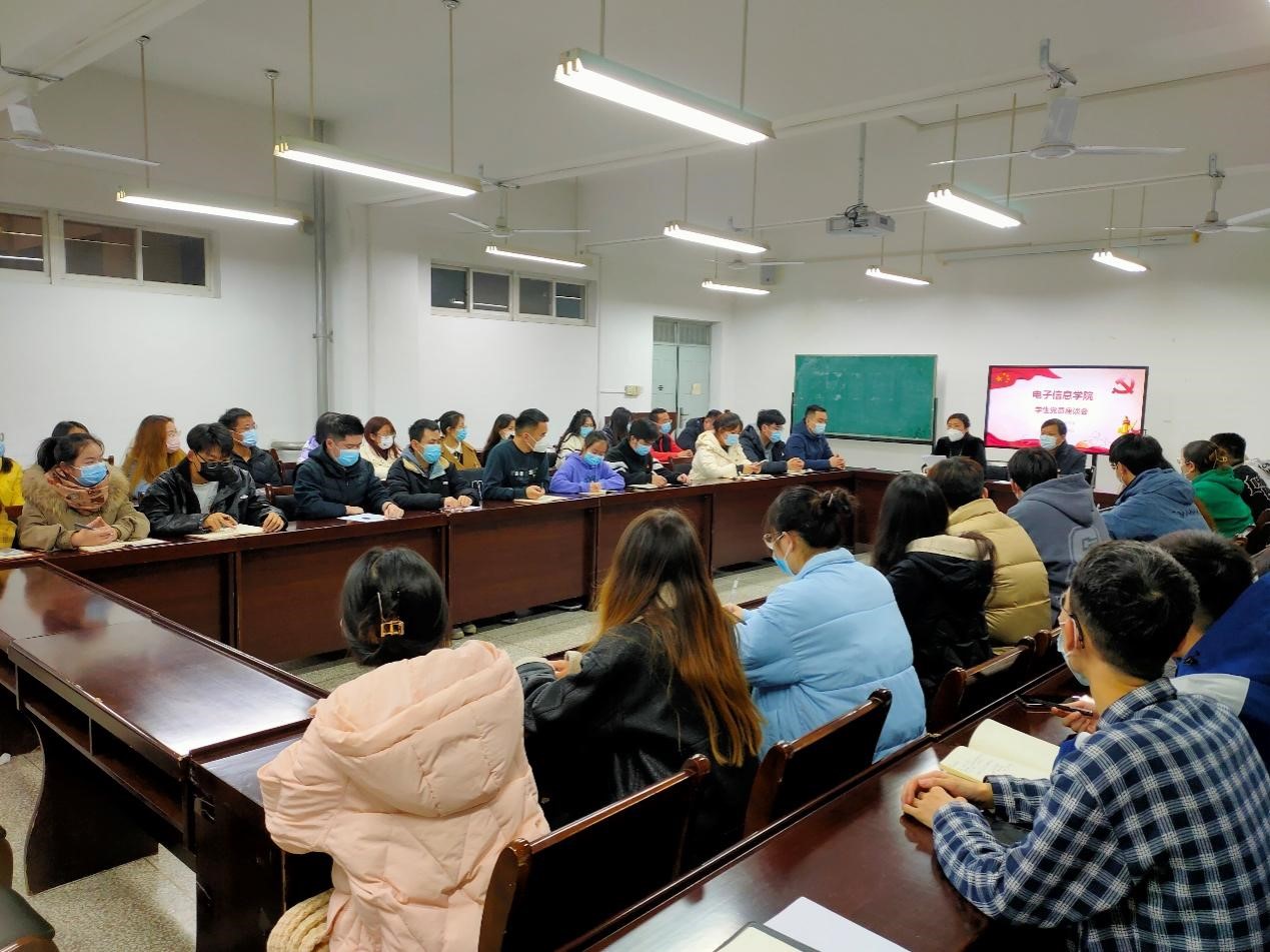 电子信息学院于11月27日在电信楼419召开学生党员座谈会,深入了解在校学生思想动态,号召学生党员在疫情防控的关键时刻充分发挥先锋模范作用,号召学生党支部在确保校园稳定安全中积极发挥基层堡垒作用,为学校平稳安全运行做出贡献。学院党委书记杨友谊、党委副书记周晓惠,全体辅导员及各学生党支部党员代表参加了本次座谈。