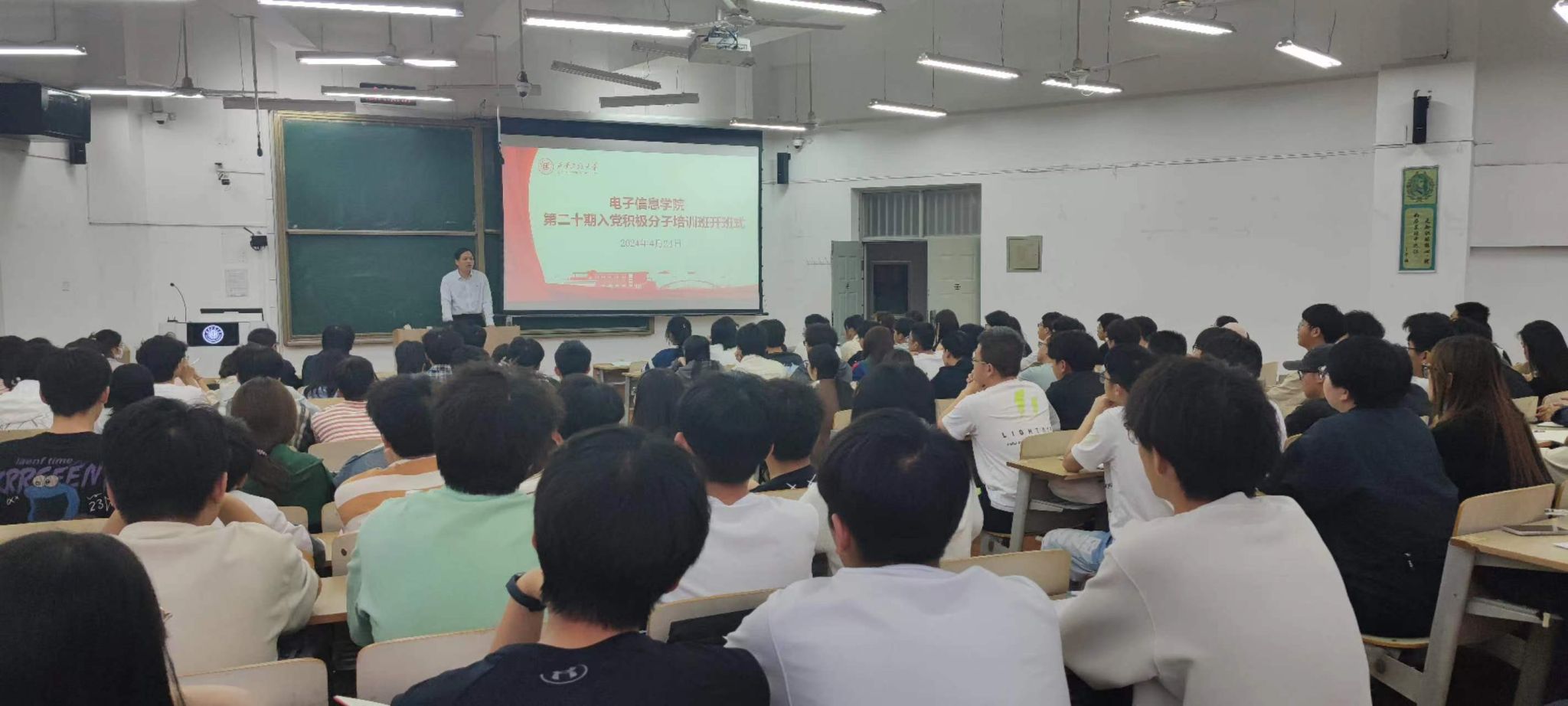 4月24日晚,电子信息学院举办第20期入党积极分子培训班开班式。学院党委书记杨友谊、副处级组织员张琪与166名入党积极分子学员参加了开班式。会议由张琪主持。培训班开班后,杨友谊讲授了第一节党课。