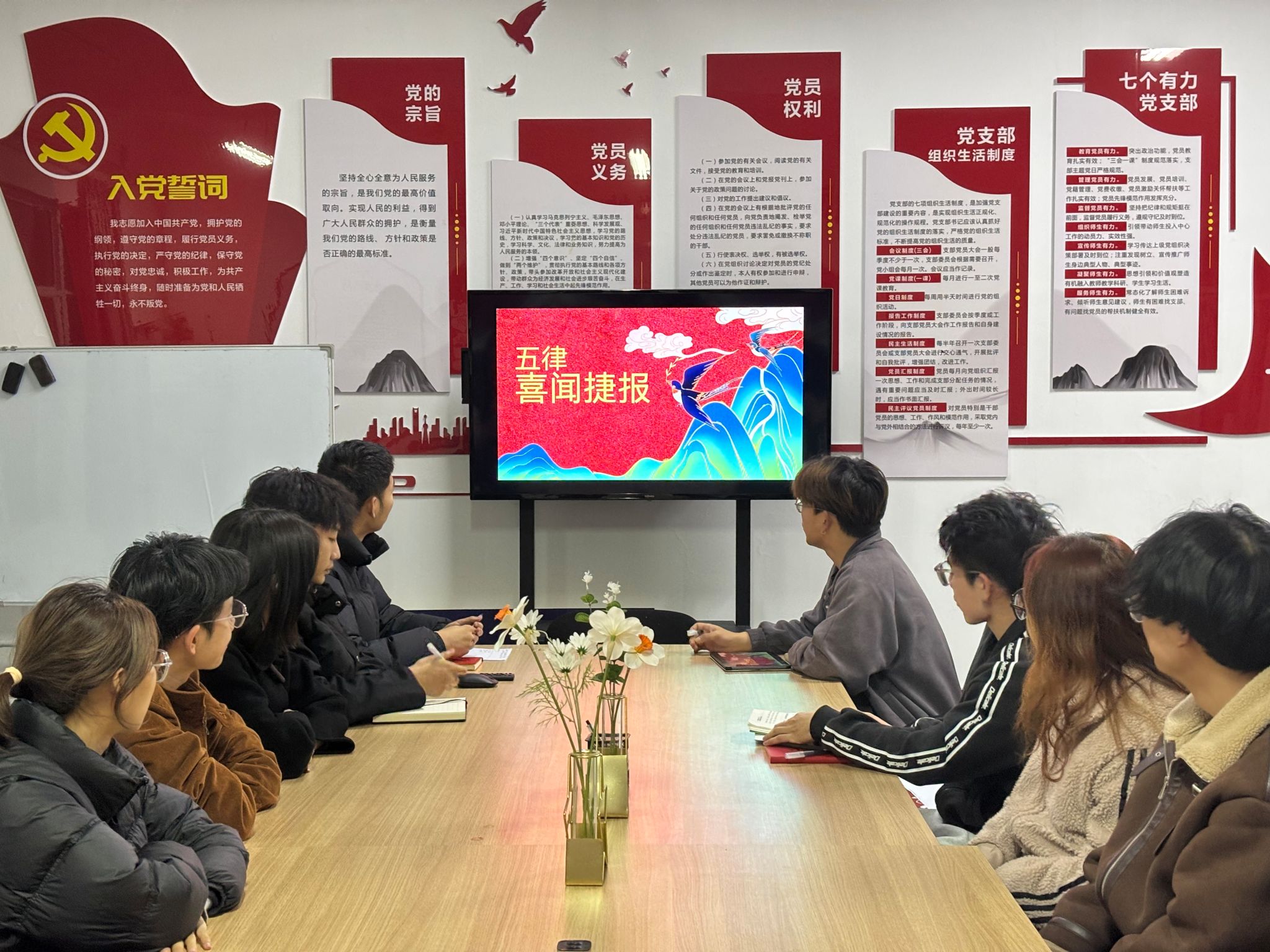支部党员李亚豪同学带领大家赏析了毛泽东的《五律·喜闻捷报》以及陕北民歌改编的《狮子眼鼓鼓》。在《五律·喜闻捷报》中,透过诗句感受到革命战争年代胜利的喜悦以及革命先辈对未来的坚定信念;《狮子眼鼓鼓》则以质朴的语言、生动的意象,展现了劳动人民对生活的热爱和对幸福的向往。李亚豪同学深入浅出的讲解,让大家深刻领略到诗歌中蕴含的情感与时代价值,现场交流气氛热烈,同学们踊跃分享自己的感悟心得。