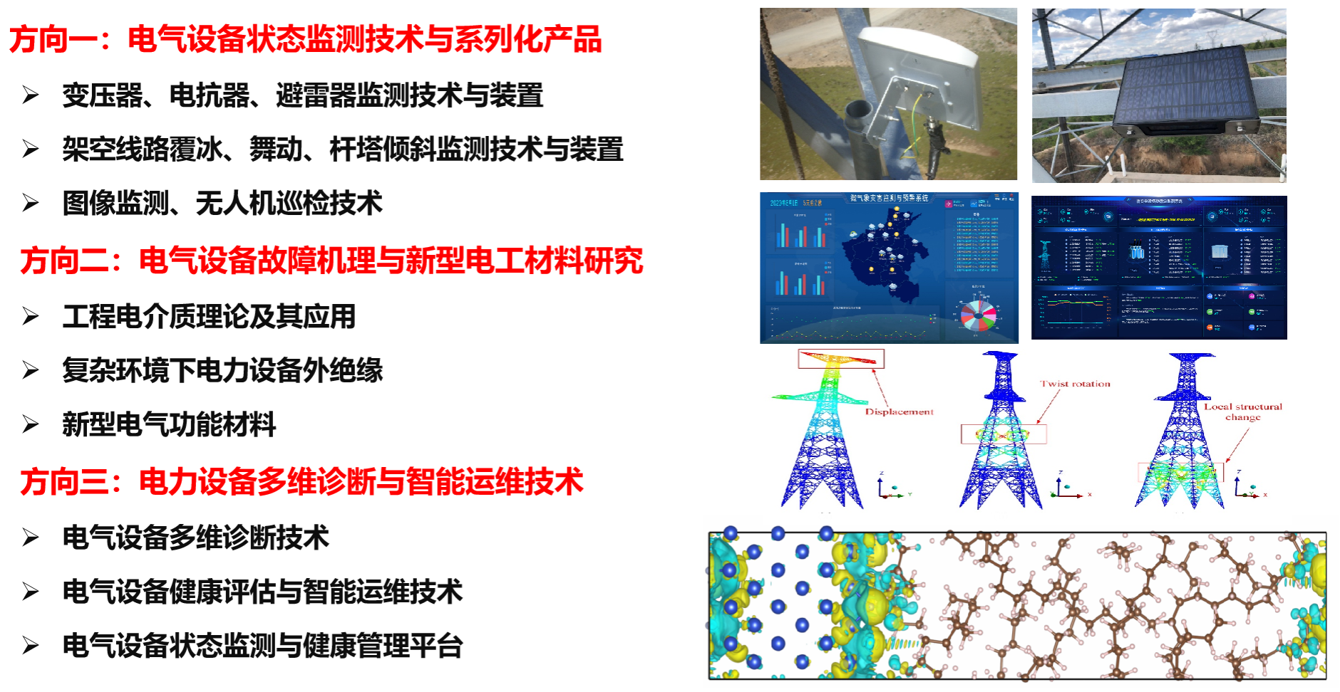 电力安全评价与智能装备研究所依托陕西省输变电设备状态监测工程研究中心、陕西省重点科技创新团队(智能电网输变电设备状态监测技术创新团队)以及西安市电气设备互联感知与智能诊断重点实验室,主要从事输变电设备状态监测与故障诊断、电力设备智能运维、输电线路结构故障机理与健康预警、绝缘电介质理论等方面的相关研究。