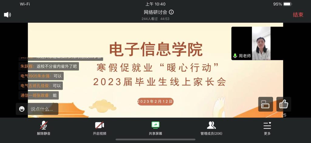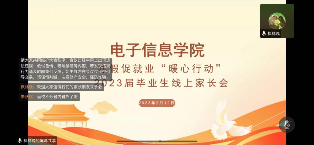 在寒假促就业“暖心行动”中,电子信息学院充分利用寒假窗口期,为毕业生提供贴心暖心的各项就业指导服务。2月12日上午,学院在线上召开2023届毕业生线上家长会,进一步推进学院毕业生就业工作。学院党委副书记周晓惠、毕业年级辅导员张天、就业工作辅导员黄木委、2023届未就业毕业生及家长参加会议,会议由张天主持。