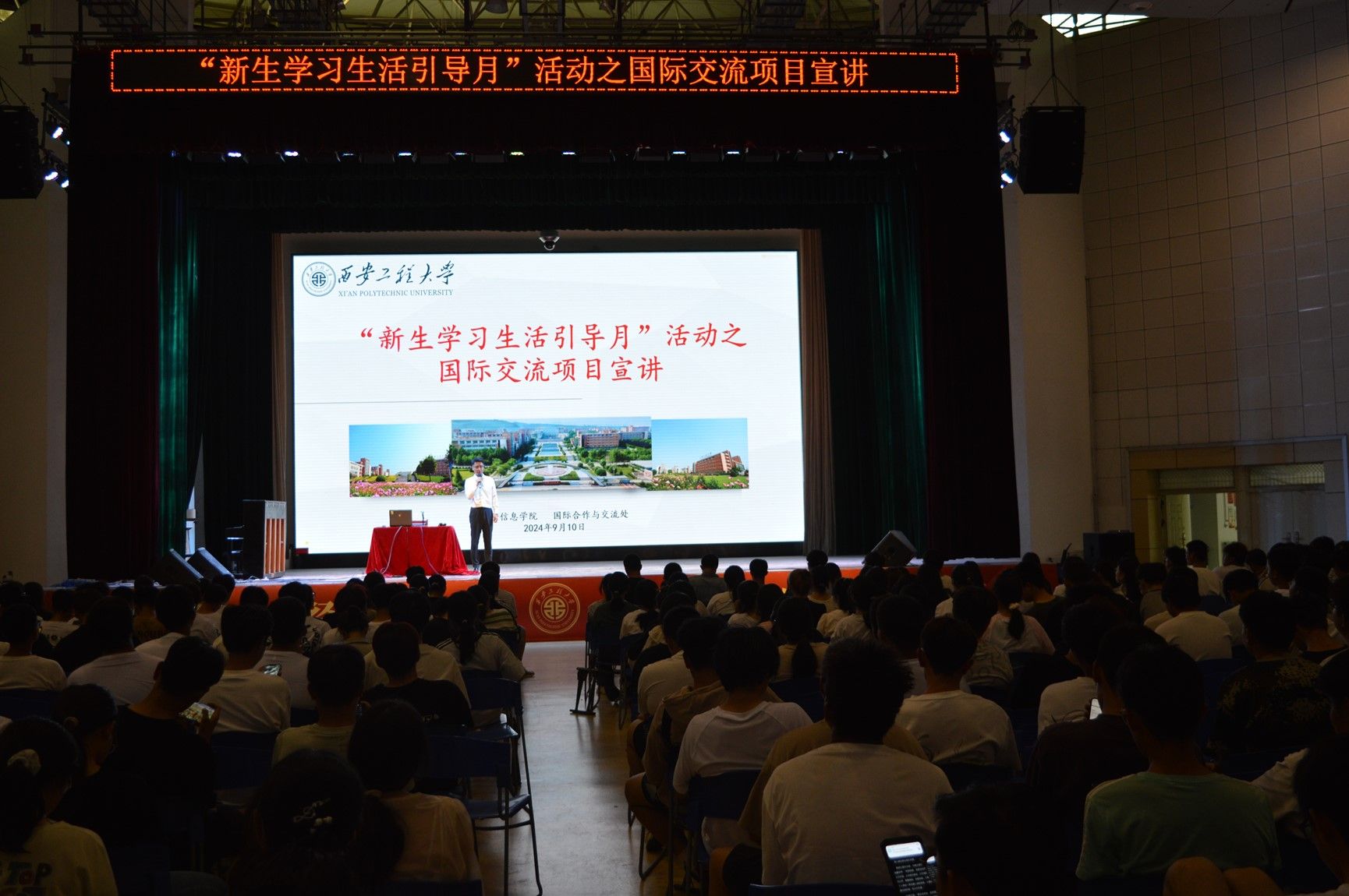 9月10日下午,电子信息学院在大学生活动中心召开国际交流项目宣讲会。校国际合作与交流处侯梦来主讲,电子信息学院2024级辅导员杨松然、胡颖及全体新生参加。