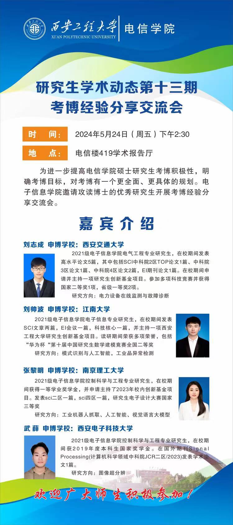 2024年5月24日下午14:30,电子信息学院研究生创新实践系列交流活动第十三期——考博经验分享交流会(一)在临潼校区电信楼419学术报告厅举行。为进一步发挥研究生朋辈力量,帮助有志于读博深造的同学了解博士申请流程,激发学生学术研究热情,规划学术发展道路,提高人才培养质量,电子信息学院邀请攻读博士的优秀研究生刘帅波、武薛、刘志成、张黎明四位同学进行交流分享。电子信息学院青年教师、研究生一百余人参加了本次活动。