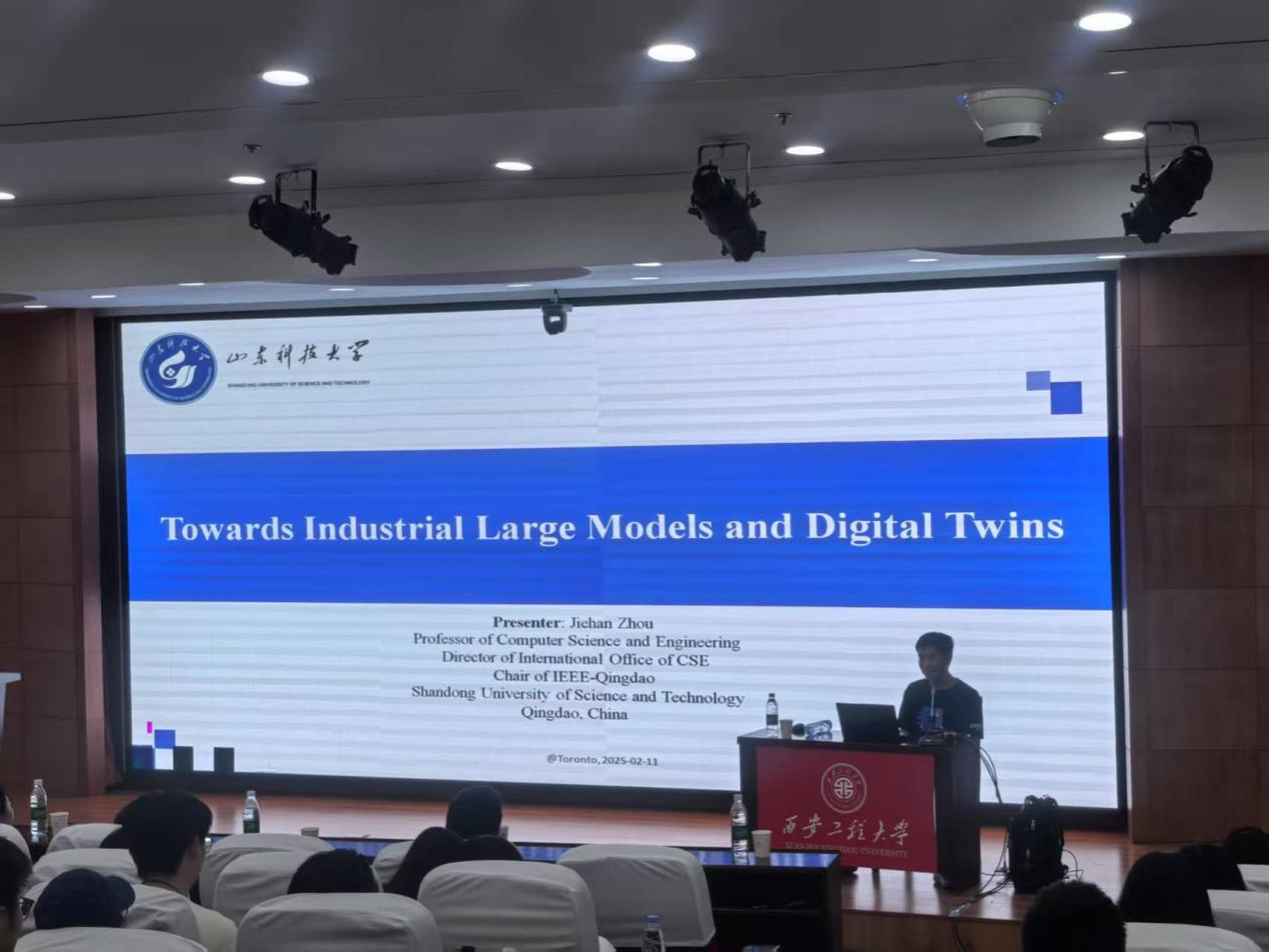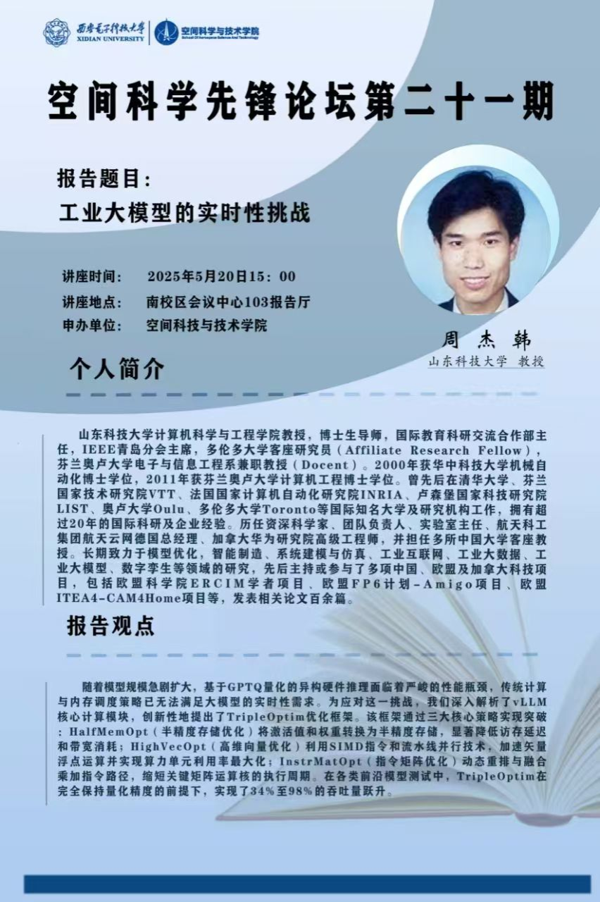 2025年5月21日上午10点,电子信息学院邀请山东科技大学周杰韩教授作了主题为《工业大模型的实时性挑战》的报告。会议在临潼校区图书馆一层报告厅举行,电子信息学院院长景军锋教授、副院长张蕾教授、电子信息学院青年教师、研究生两百余人参加了本次学术报告会,会议由张蕾副院长主持。