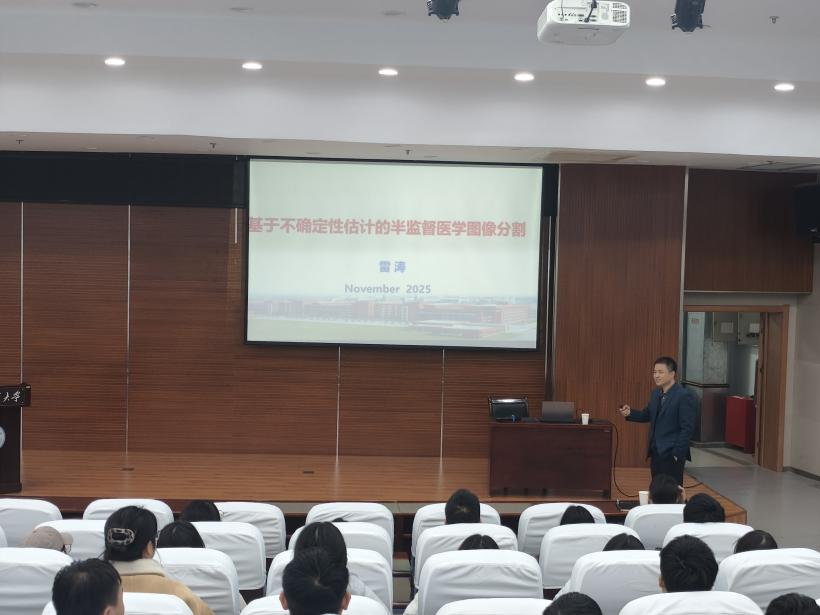 2025 年 11 月 14 日上午8 时,电子信息学院邀请陕西科技大学人工智能学院副院长雷涛教授作了主题为《半监督医学图像分割研究进展》的报告。报告会在临潼校区图书馆二层报告厅举行电信学院副院长张蕾教授、电子信息学院青年教师、研究生两百余人参加了本次学术报告会。会议由张蕾教授主持。