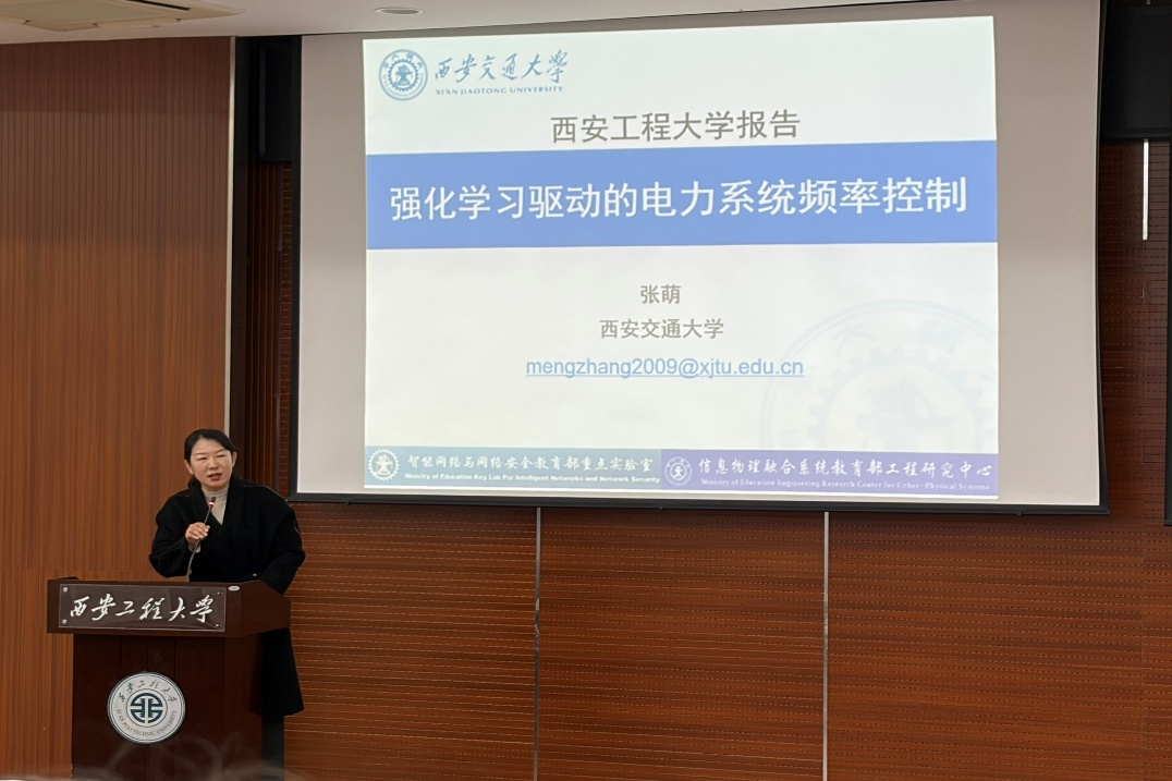 2025年12月11日下午3:00,西安工程大学第七十九期经纬学术沙龙在临潼校区图书馆二层报告厅举行。本次活动由电子信息学院承办,邀请了西安交通大学张萌教授带来主题为《强化学习驱动的电力系统控制》的学术报告。西安工程大学电信学院副院长张蕾教授、电子信息学院青年教师、研究生两百余人参加了本次学术交流活动。会议由张蕾教授主持。