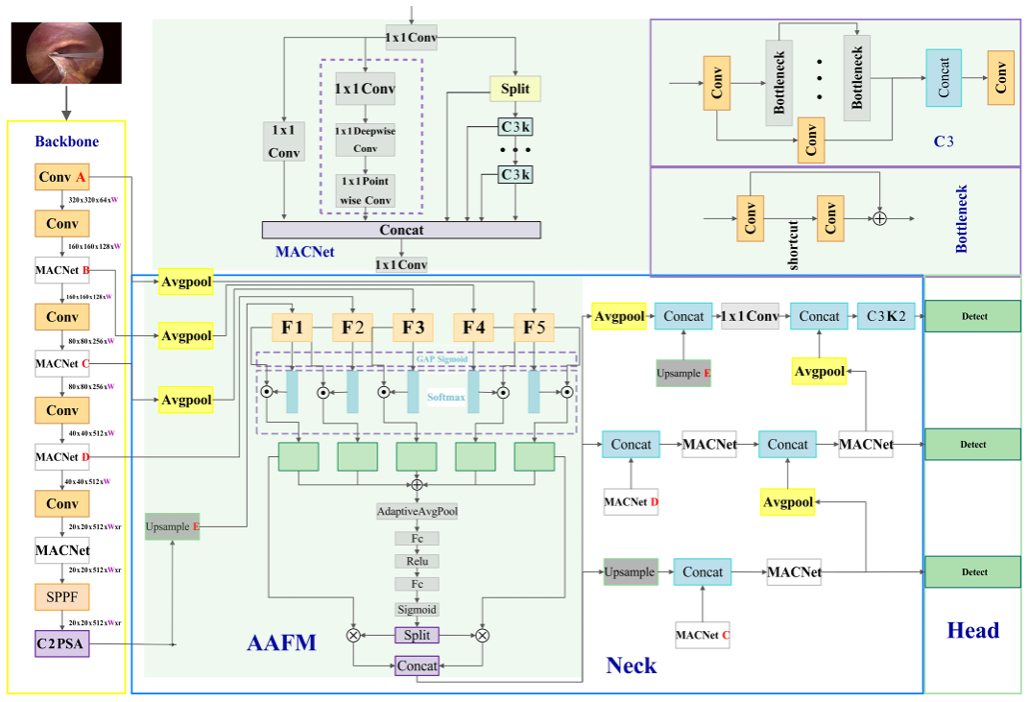 论文3 “ToolH-YOLO: A Hybrid Feature Fusion Framework for Occlusion-Robust Surgical Instrument Detection.”针对腹腔镜场景中常见的遮挡、血液污染与烟雾干扰导致的检测性能退化问题,提出遮挡鲁棒检测框架 ToolH-YOLO:构建 MACNet 以增强多分支深度聚合的特征表达能力,并设计 AAFM 进行多尺度自适应注意融合,从而提升复杂背景与遮挡条件下的定位与识别鲁棒性。实验表明,该方法在 M2CAI16-Tool-Locations 上达到 97.2% mAP@0.5,并在遮挡更强的数据集与 COCO2017 上进一步验证了性能提升与跨域泛化能力。